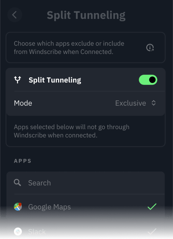 There are cases when you don't wish to tunnel all your traffic through a VPN. Windscribe lets you choose which apps you want to include or exclude from the tunnel.